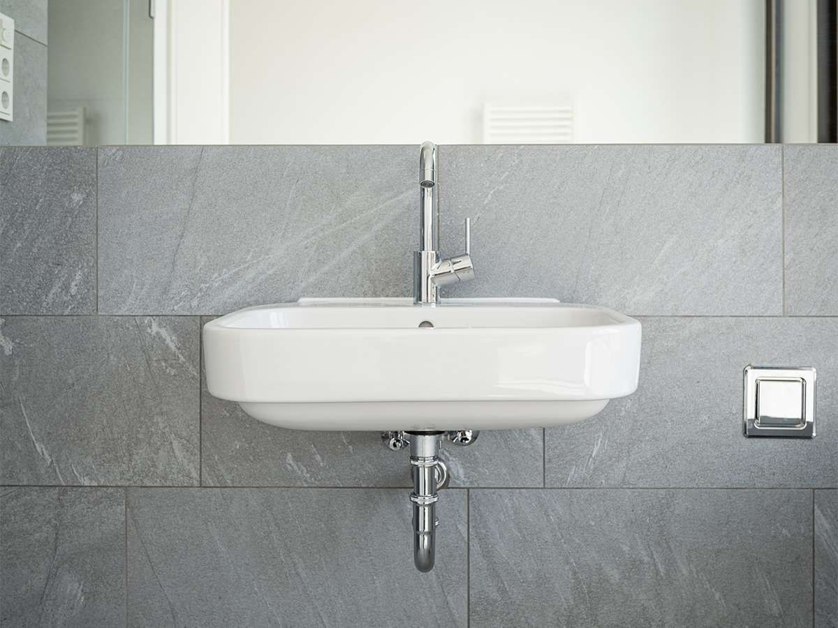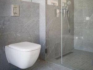 In the bathrooms, too, special attention is paid to the use of timeless materials. Large-format grey tiles are laid on the walls and floors. Discreet bathroom ceramics, such as the Duravit washbasin “Happy D.2” or the timeless toilet cabinet “Happy D.2” for clear geometric shapes. The stainless steel sanitary ware from Hansgrohe with its puristic lever handles is also timeless. In addition, all shower enclosures are installed at floor level, which ensures pleasant showering comfort.