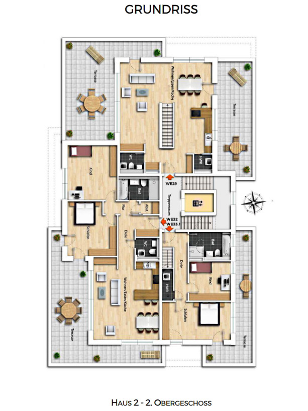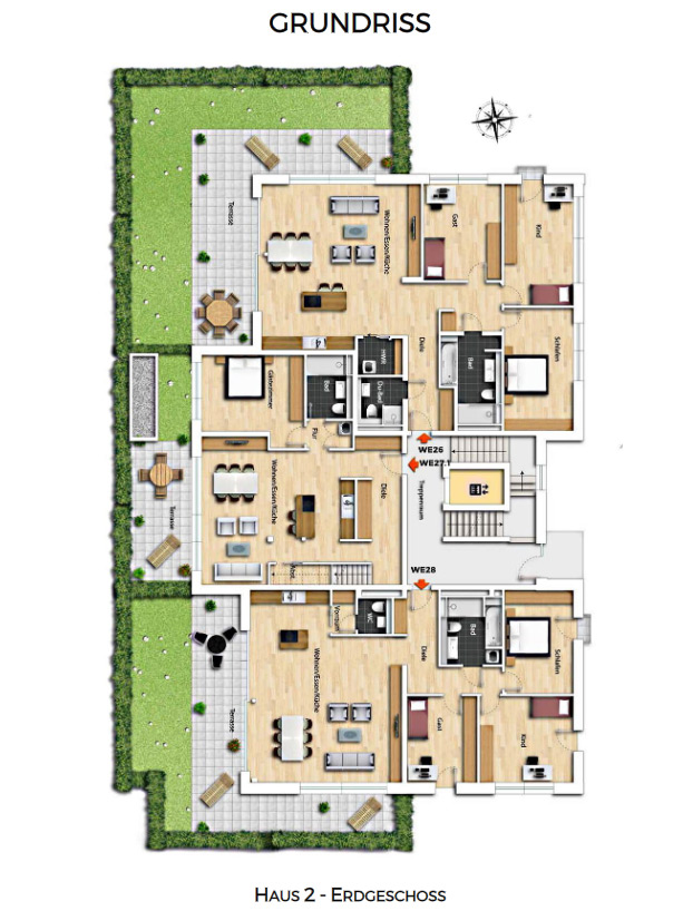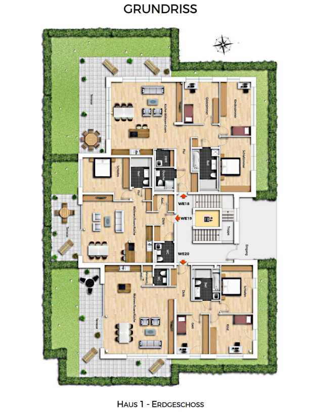 Each building have 9 or 10 residential units with living space from approx. 58 m² to 170 m². From the classic 2-room apartment to a large maisonette apartment with large terraces, everything is included. Apartments on the ground floor are planned as barrier-free, and the upper apartments have fireplaces on the 3rd floor.